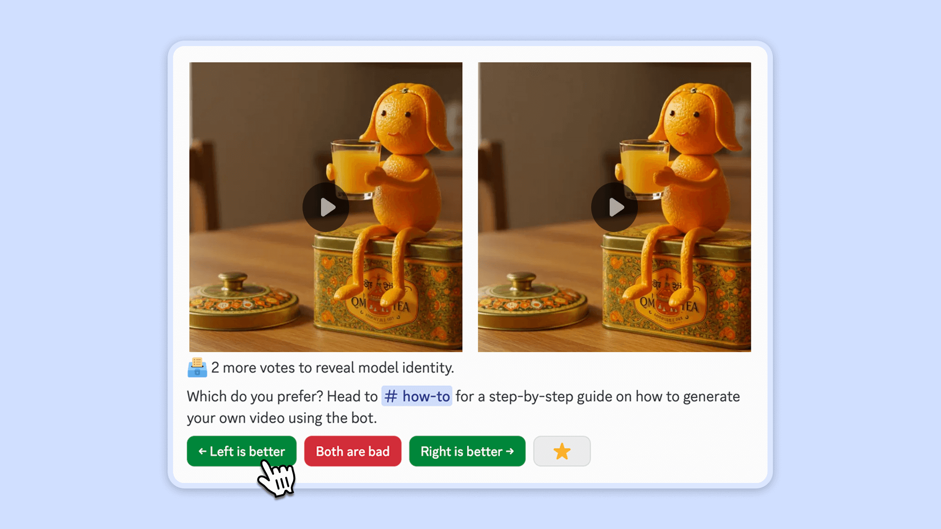 Join our community on Discord to start voting, generating videos and powering the leaderboard.
