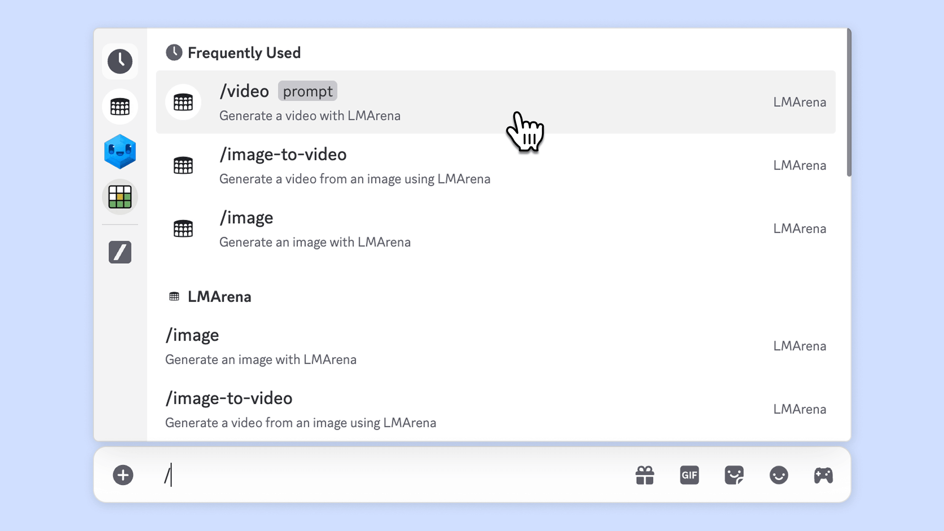 The Arena Video bot is only available in our Discord server for now. You can join us by clicking this link: https://discord.gg/LMArena